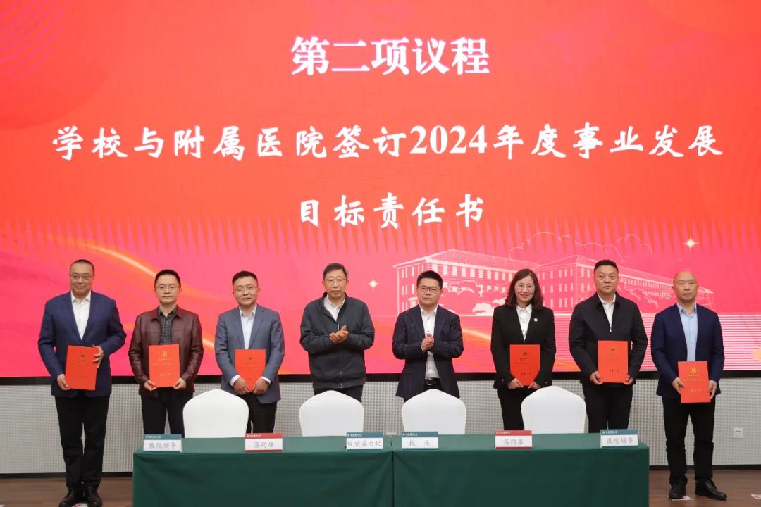 在前期,华体会官方版网站登录入口与医院充分沟通、反复协商、达成共识的基础上,确定了各附属医院2024年事业发展目标任务。校党委书记覃正杰、校长黄爱龙与承担KPI任务的附属医院党政领导逐一签订目标责任书。