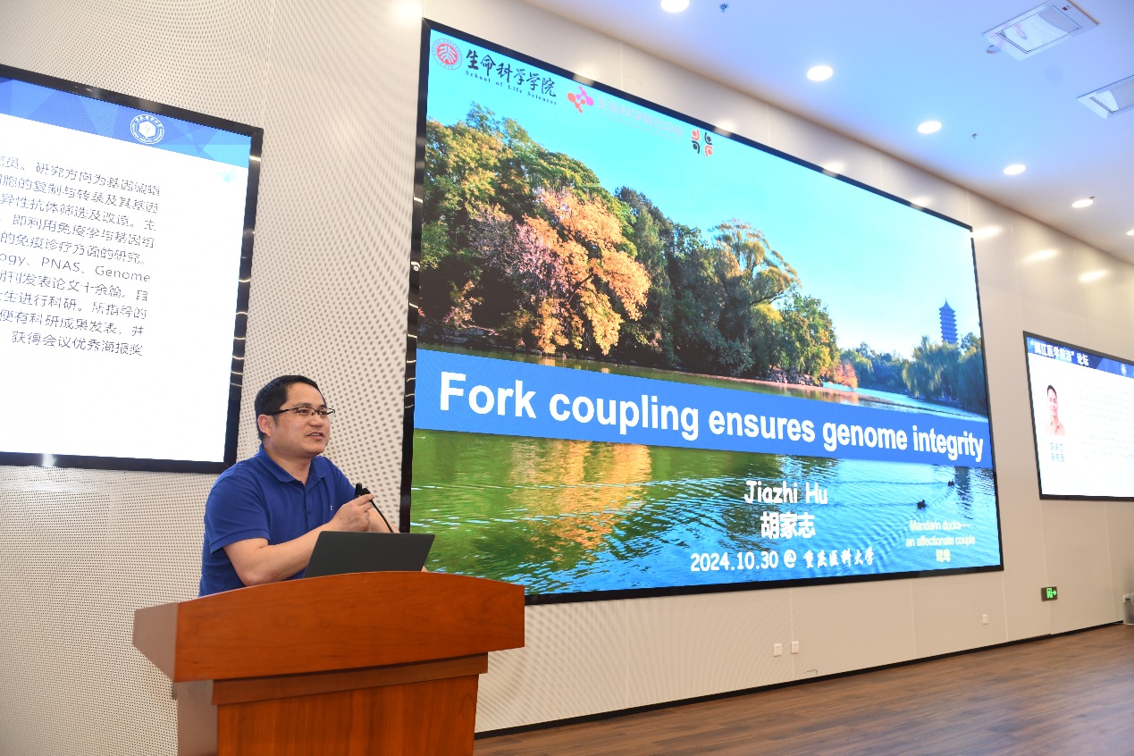 北京大学生命科学学院的胡家志研究员作了题为《从染色质视角透视哺乳动物DNA复制》学术报告。胡家志研究员率领团队通过研究转录活动和染色质的三维结构来重新诠释DNA复制的复杂过程,此外,他们还发现了在染色质环的形成和锚定中起关键作用的黏连蛋白Cohesin可以调控DNA复制时序以维持基因组完整性。这些发现揭示了DNA复制叉在复杂染色质环境中的空间组织模式,为理解DNA复制提供了全新的视角。