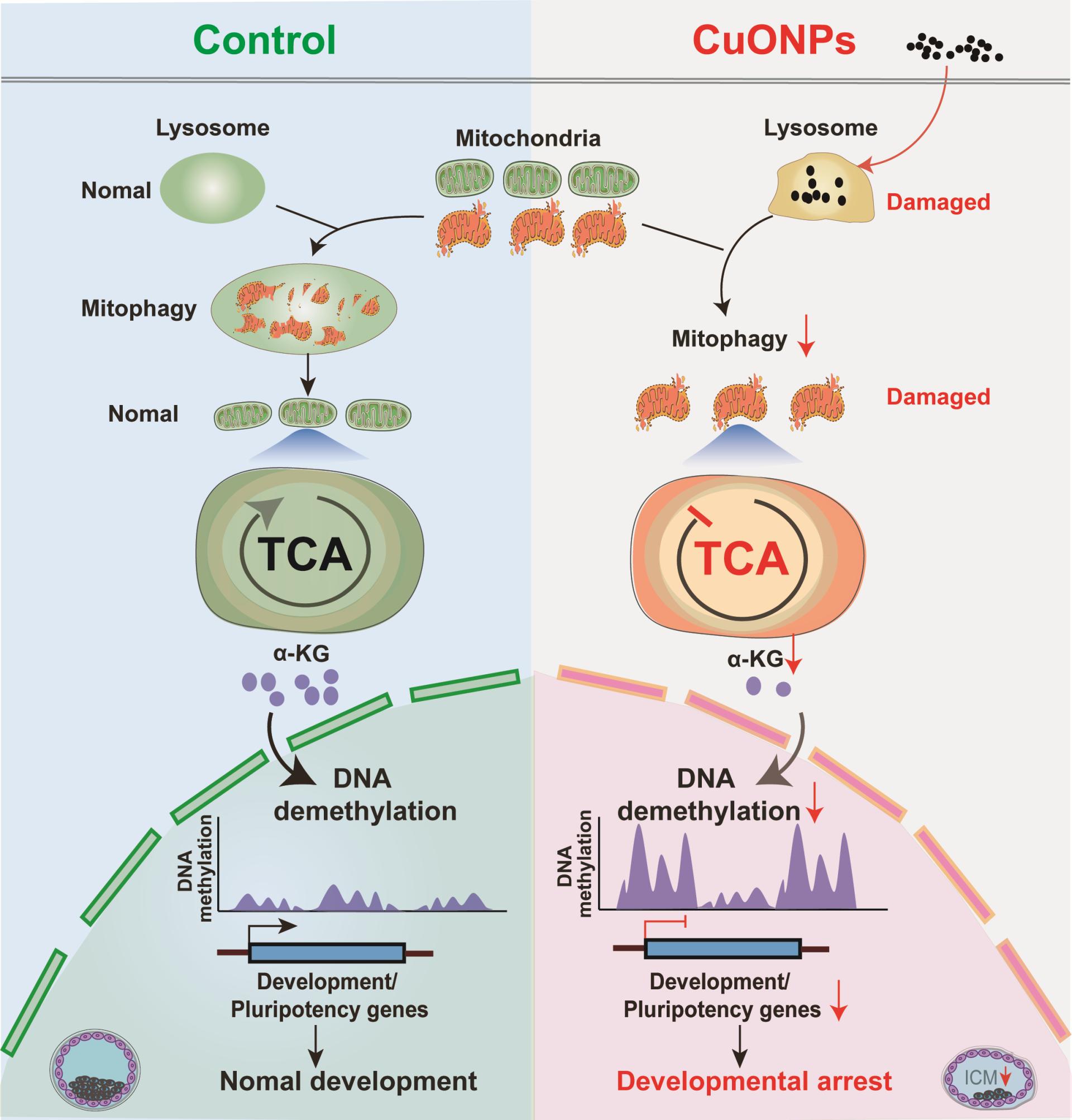 在该研究工作中,作者通过小鼠胚胎体外实验,证实了CuONPs暴露具有胚胎发育毒性。有趣的是,即使移植形态学正常的囊胚,其活产率依然降低,推测可能是囊胚内细胞团的多能性受到了影响。随后,作者利用小鼠胚胎干细胞证实了CuONPs对多能性的影响。机制上,CuONPs沉积破坏溶酶体功能,损伤线粒体自噬,导致三羧酸循环代谢物α-KG含量降低,抑制DNA去甲基化修饰,加剧异染色质化,进而抑制发育和多能性相关基因的表达。此外,作者还发现辅助生殖助孕人群尿液的Cu元素含量与临床结局呈负相关,提示CuONPs潜在的生殖毒性。该工作从线粒体自噬-代谢途径证实了CuONPs对植入前胚胎发育的毒性及其分子机制,并为研究纳米颗粒暴露对人类生殖健康提供了新见解。