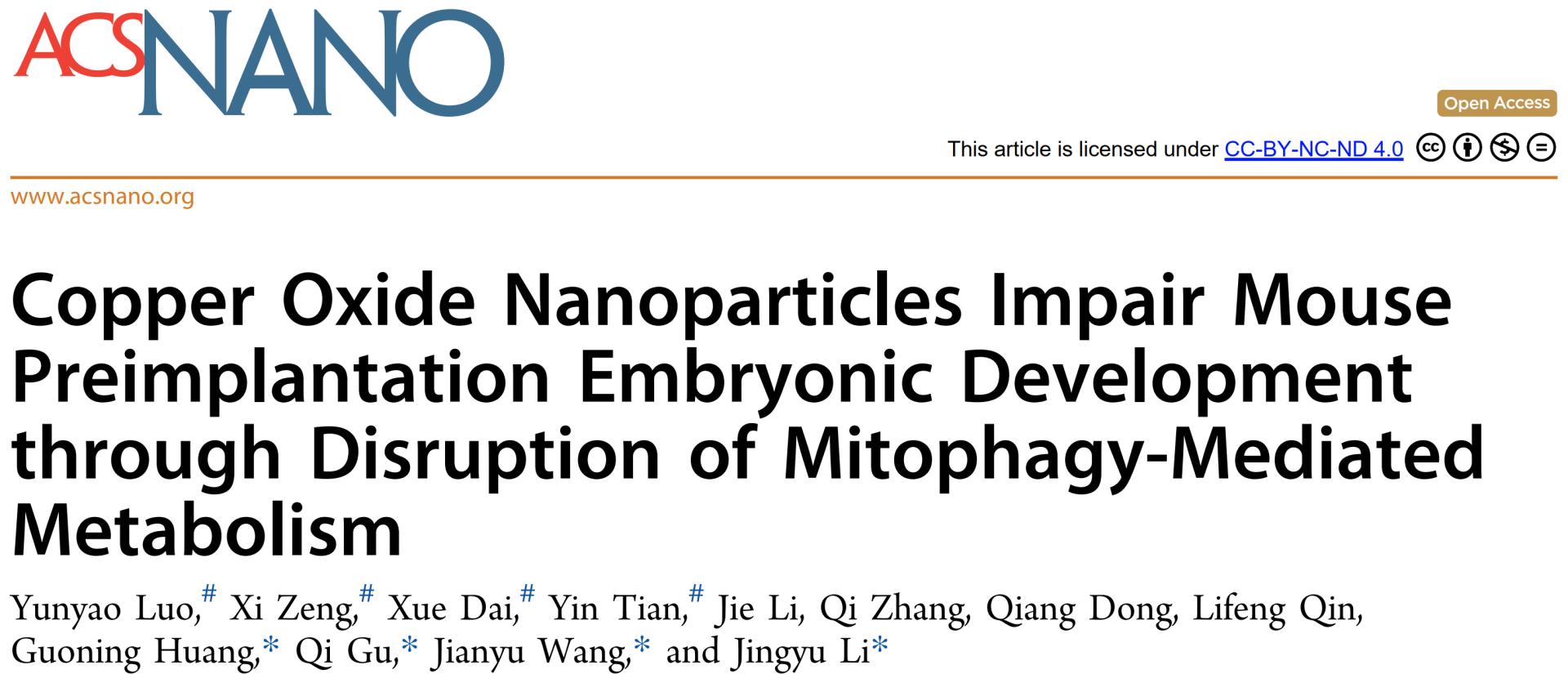 11月2日,我校附属妇女儿童医院生殖医学中心李竞宇/黄国宁、华体会官方版网站登录入口王健宇以及中国科学院动物研究所顾奇团队合作在ACS Nano期刊上发表了题为Copper oxide nanoparticles impair mouse pre-implantation embryonic development through disruption of mitophagy-mediated metabolism的最新研究成果。该研究揭示CuONPs暴露可通过线粒体-代谢途径,影响DNA去甲基化,从而抑制发育及多能性基因表达诱导植入前胚胎发育毒性。