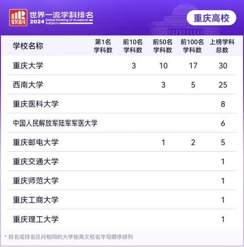 11月11日,高等教育评价专业机构软科发布2024“世界一流学科排名”。我校共有8个学科上榜,上榜学科数量位居在渝高校第3位,其中生物医学工程进入世界前150名,护理学进入世界前200名。