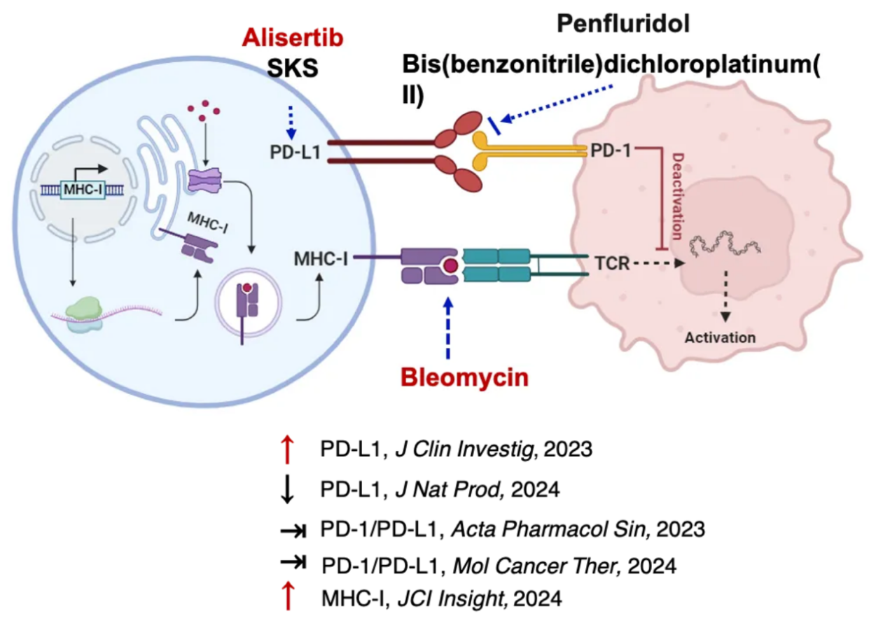 党永军教授在肿瘤免疫相关的小分子药物研发方面有着丰富的研究经验,课题组前期发现了一系列调控肿瘤微环境的活性小分子。例如:Aurora A抑制剂Alisertib通过上调PD-L1表达抑制小鼠T细胞抗肿瘤免疫反应,促进肿瘤免疫逃逸和耐药(J Clin Invest,2023);海洋天然产物SKS通过直接靶向JAK下调PD-L1表达,具有非常好的抗肿瘤免疫活性(J Nat Prod,2024)。这些前期研究为本项目的顺利实施提供了坚实的基础。
