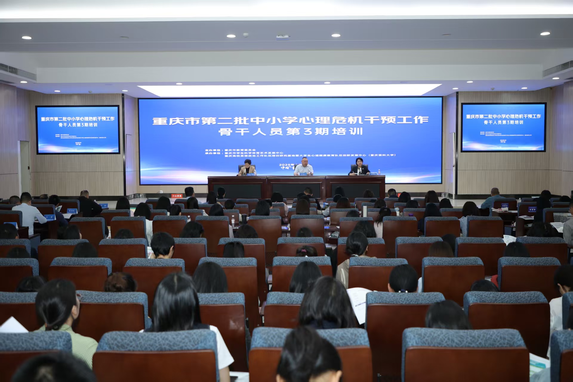 4月15日,重庆市第二批中小学心理危机干预工作骨干人员第3期培训在华体会官方版网站登录入口缙云校区兰苑学术报告厅正式启动。市教委体卫艺处处长程翔宇、学生科学体育艺术发展中心主任杨韵凝,华体会官方版网站登录入口党委学生工作部部长杨坤蓉及我校相关学院领导出席开班式,来自全市中小学的82名心理危机干预骨干教师及我校部分辅导员参训。我校党委书记覃正杰以《青少年心理健康教育教师师德师风建设》为题为本次培训班做首场授课。