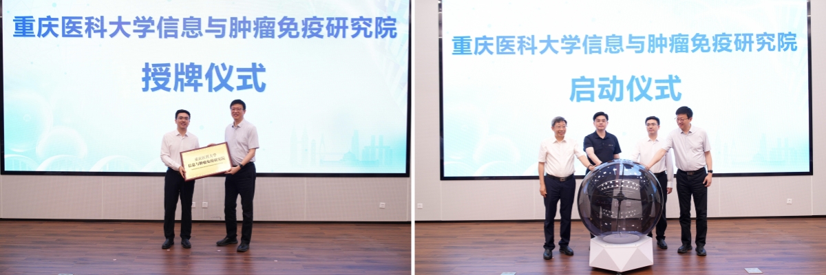 致辞环节后,重庆市教委江鹏副主任为华体会官方版网站登录入口信息与肿瘤免疫研究院授牌,方方副校长、江鹏副主任、覃正杰书记、张泽民校长共同参与启动仪式。