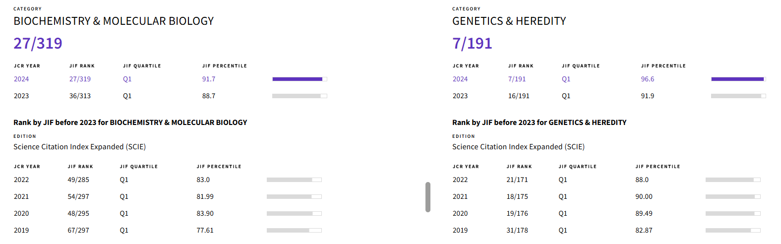近日,科睿唯安(Clarivate Analytics)发布的2024年度最新SCI《期刊引证报告》(Journal Citation Reports,简称JCR)显示,Genes & Diseases《基因与疾病(英文)》最新影响因子为9.4,稳居Biochemistry & Molecular Biology和Genetics & Heredity两个学科Q1区,排名较去年有明显提升。Biochemistry & Molecular Biology学科排名从36/313升至27/319,进入前10%;Genetics & Heredity学科排名从16/191上升至7/191,进入前5%。