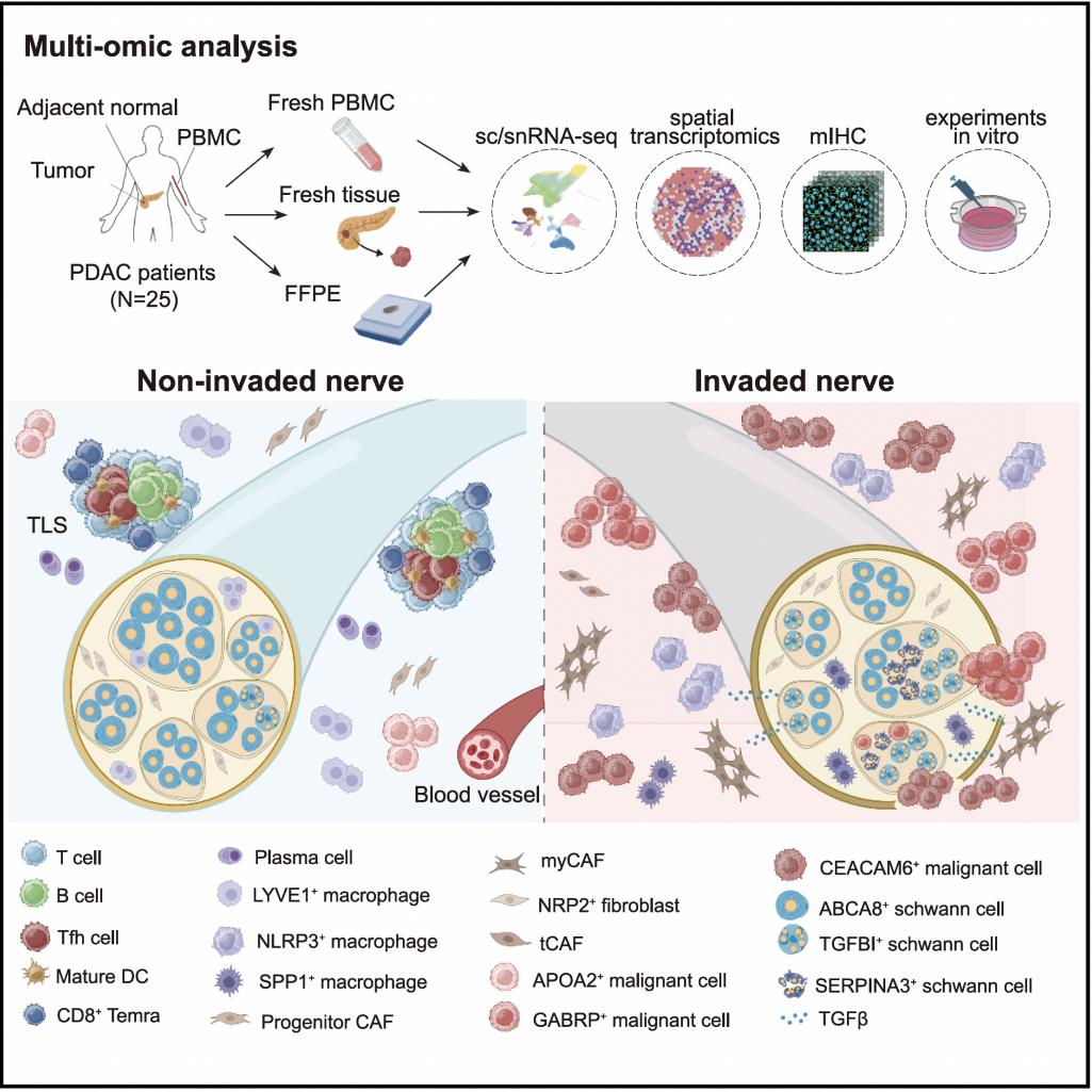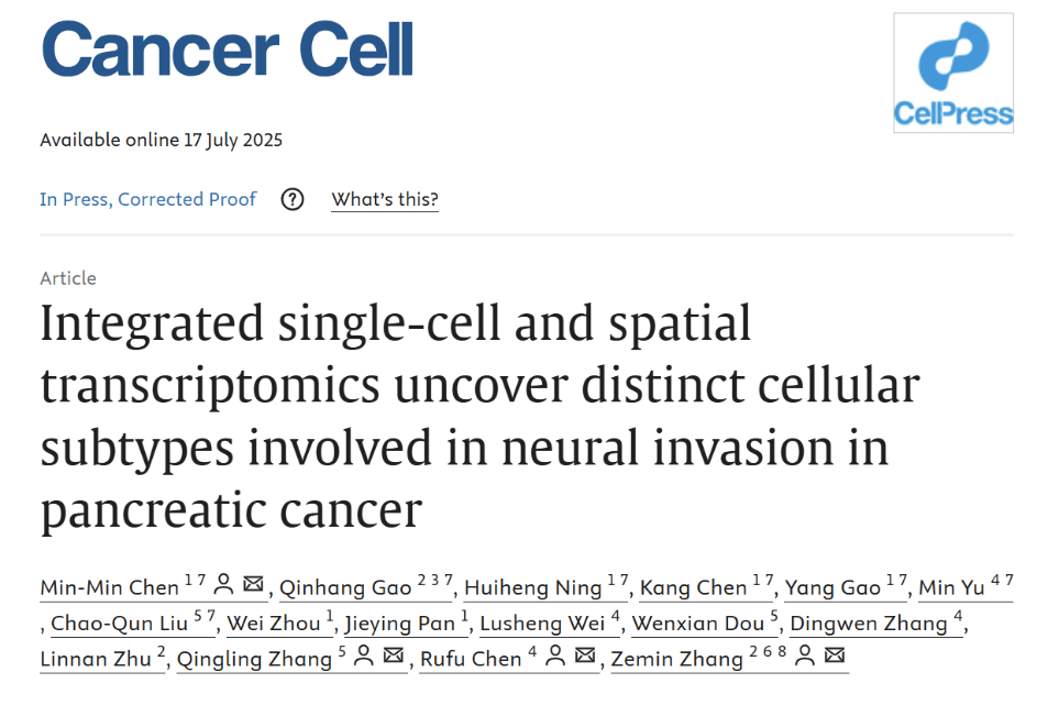 2025年7月17日,我校张泽民教授团队及合作者在Cancer Cell杂志发表题为“Integrated Single-Cell and Spatial Transcriptomics Uncover Distinct Cellular Subtypes Involved in Neural Invasion in Pancreatic Cancer”的研究长文,揭示了胰腺导管腺癌发生神经束侵袭转移的细胞及分子机制。