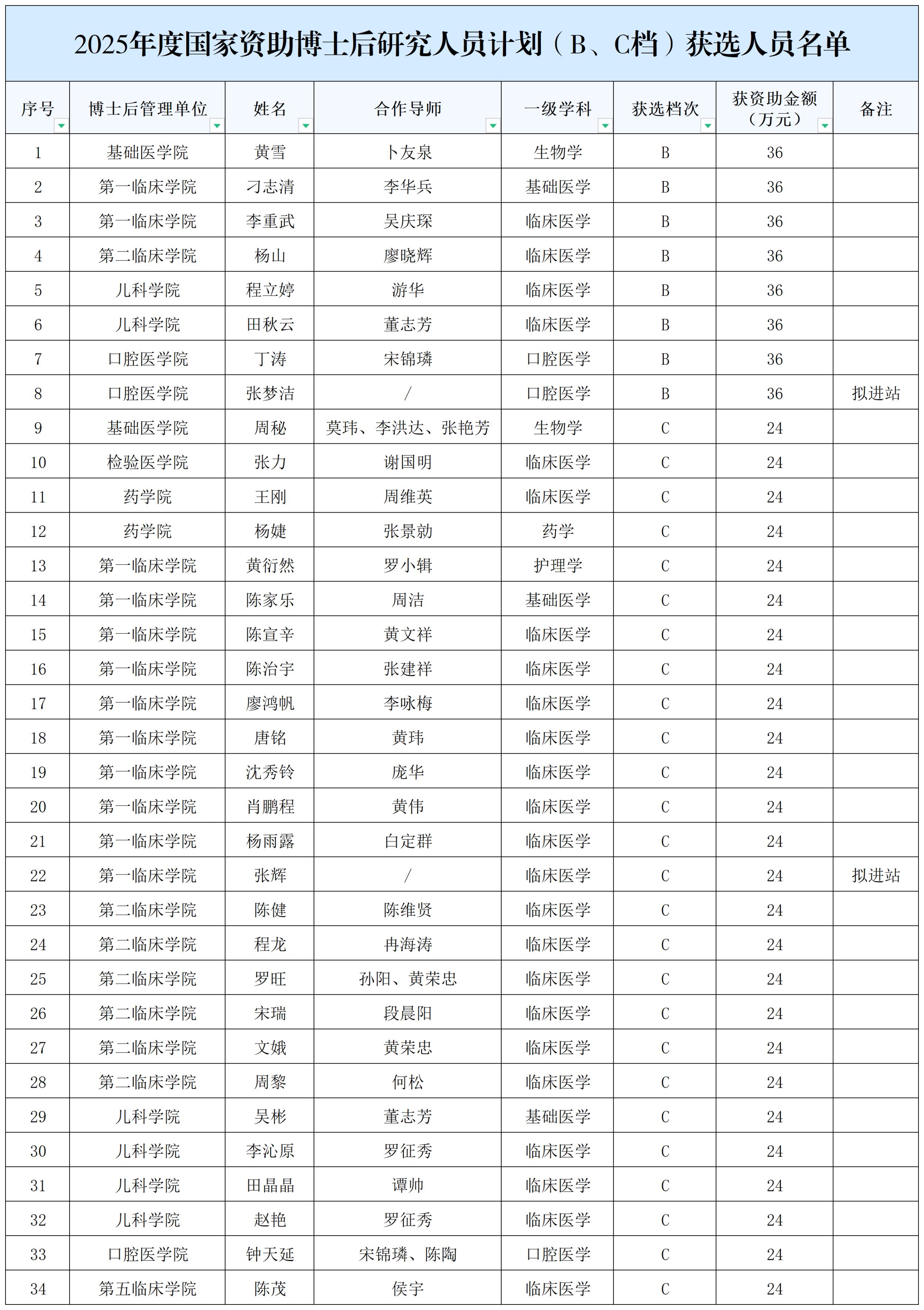 近日,全国博士后管委会办公室和中国博士后科学基金会印发了《2025年度国家资助博士后研究人员计划(B、C档)获选结果的通知》(博管办〔2025〕90号),华体会官方版网站登录入口黄雪等34名博士后获选,获选人数比去年同期增长78.95%,为历史最好成绩。