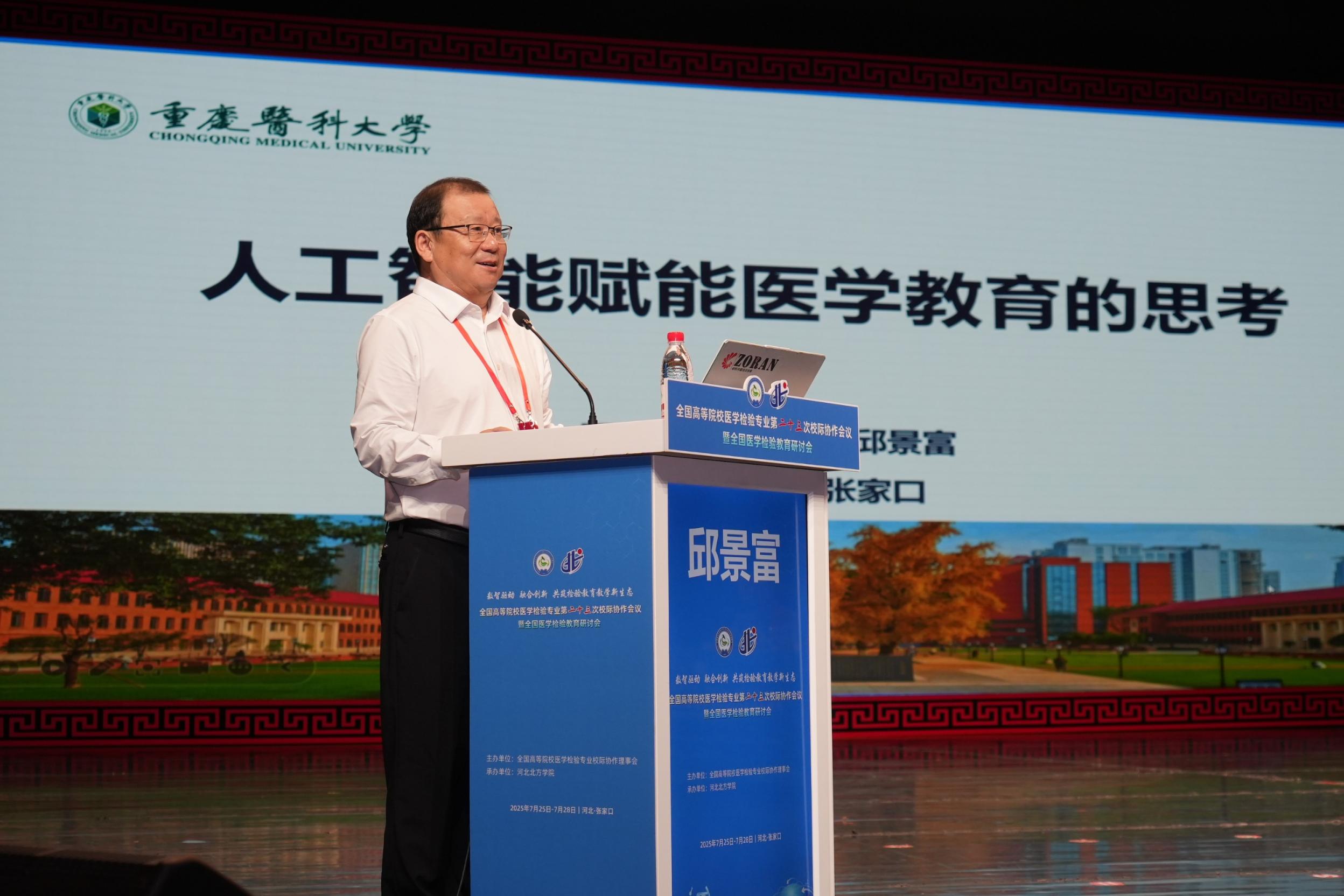 副校长邱景富教授受邀参加本次会议,并作题为“人工智能赋能医学教育的思考”的大会报告。他指出,医学教育作为“健康中国”和“教育强国”两大国家战略的重要交汇点,正在经历人工智能驱动下的第四代发展阶段,人工智能正推动医学教育实现教育教学全要素的智能化融合与转型。他在报告中分享了我校在人工智能赋能医学教育建设中的实践经验,重点展示了人工智能在检验医学领域的应用,提出“构建‘人机共生、育人为本’医学教育新生态”的未来展望。