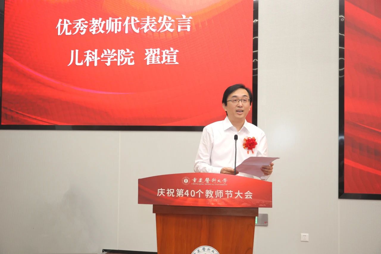 儿科学院教师翟瑄作为优秀教师代表发言。他结合自己教书育人的工作实践,分享了从教以来的感悟和体会。他叮嘱年轻的教师,为师者,身教重于言传,想把学生培养成什么样的人,自己就应该成为什么样的人,对学生要视如己出。他表示,教学相长,教师铸就了学生未来的辉煌,学生则成就了教师一生的荣光,教师最大的荣耀是培养了比自己更优秀的学生。他感谢华体会官方版网站登录入口为老师们的发展提供了平台和空间,也使重医的优秀传统得以传承,使重医的创新精神生生不息。