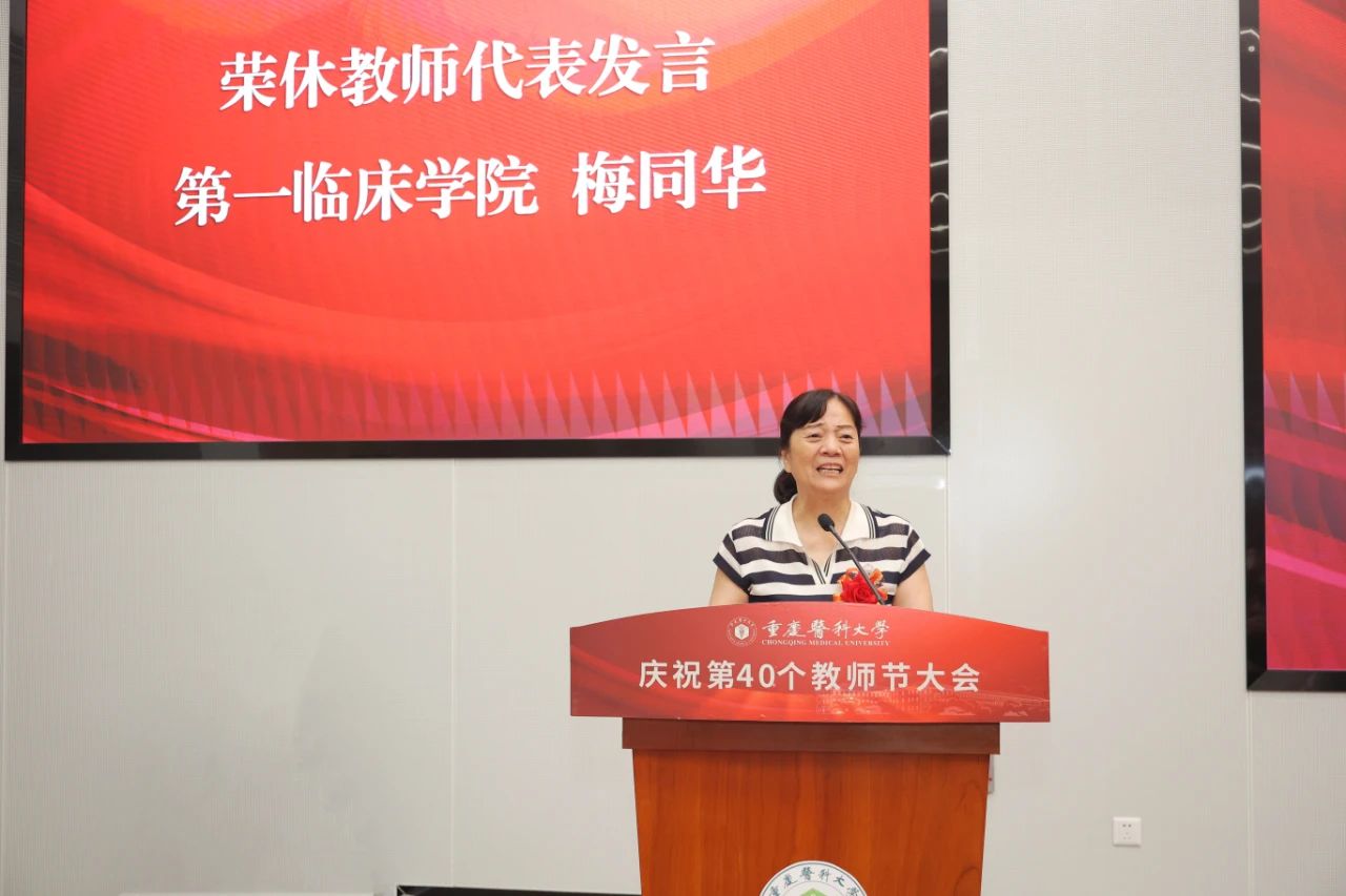 荣休教职工代表,第一临床学院梅同华老师发言。她回顾了自己在华体会官方版网站登录入口和医院工作的时光,从三尺讲台到无影灯下,从细致的病理解剖到严谨的教学查房,从宝贵的经验传承到关键的学术引领,几度春秋更迭,教师和医生的双重身份让她为国育才的信念更加笃定。她希望年轻一代的学子在更大范围内认知世界,在医学领域内实现突破,不负韶华,不负梦想,不负未来。