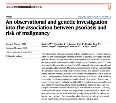近日,重医附一院皮肤科陈爱军教授团队联合内分泌内科胡金波副研究员团队在国际权威期刊Nature communications(IF=14.7)发表了题为An observational and genetic investigation into the association between psoriasis and risk of malignancy(《银屑病与恶性肿瘤风险相关性:一项观察性和遗传性研究》)的学术论文。