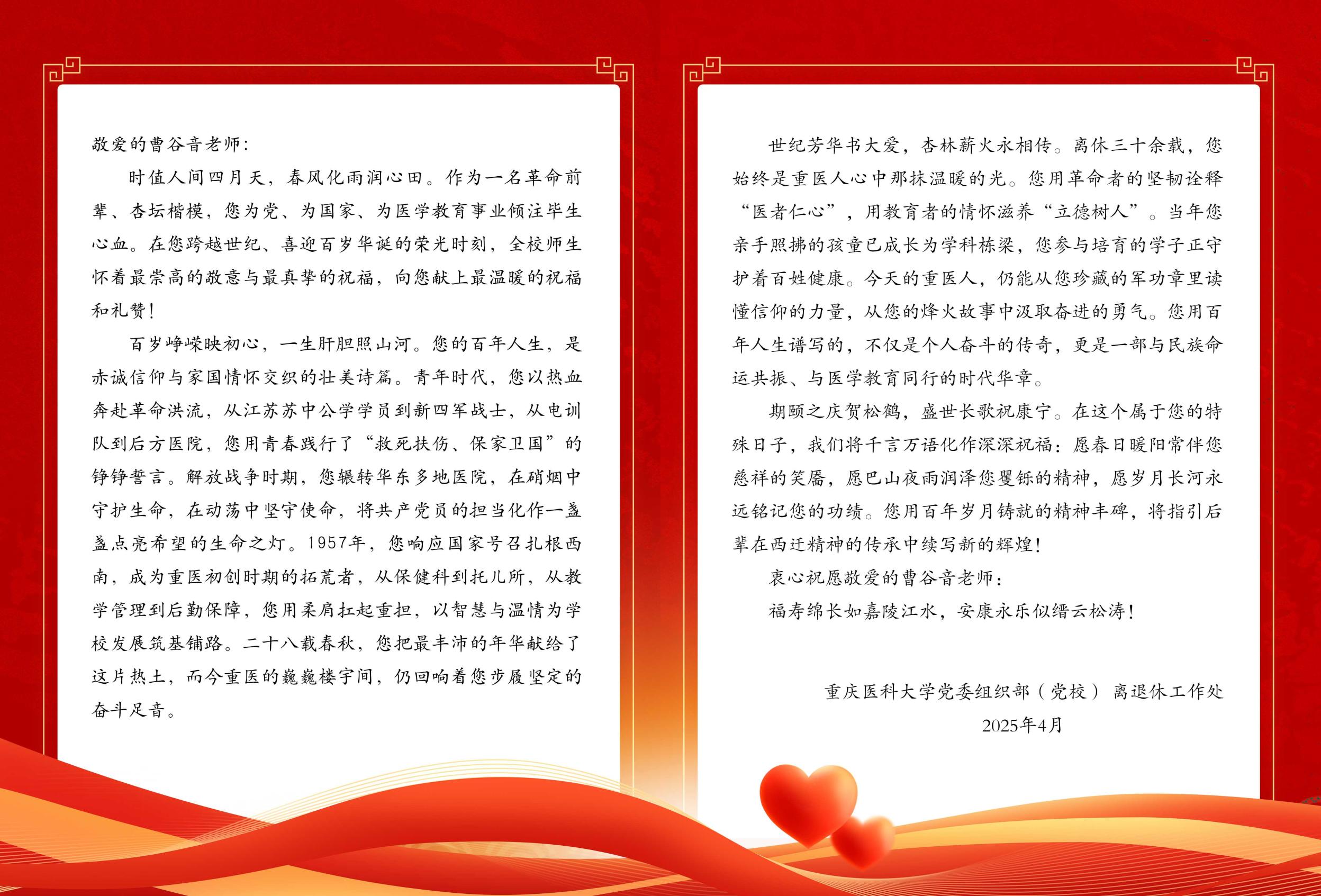 4月29日,离休干部曹谷音老人迎来了她的百岁寿辰,为表达华体会官方版网站登录入口对曹老荣登百岁的诚挚慰问和祝福,校党委组织部、离退休工作处相关负责人一行专程前往曹谷音老人家中,向老寿星送上了一份特别的关爱和关怀。