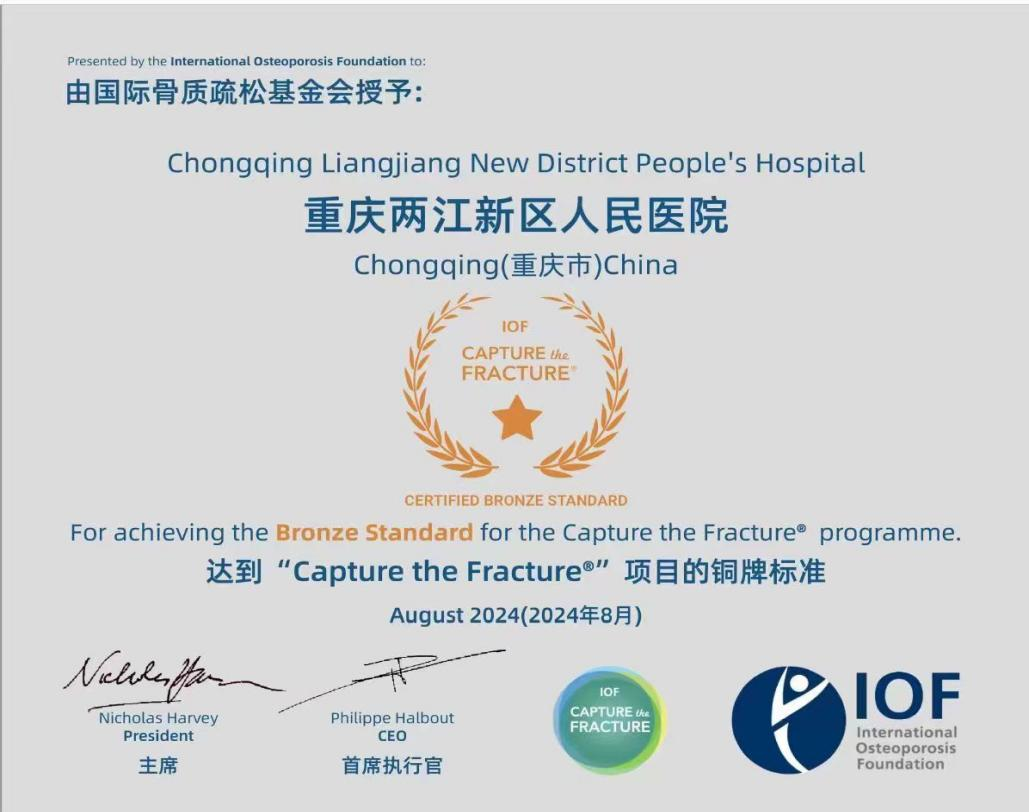 近日,附属两江医院风湿免疫科杜金万诊疗团队申报的FLS(国际骨质疏松症基金会骨折联络服务)获得国际骨质疏松基金会(IOF)认证铜牌等级,重庆仅3家医疗机构获得认证。