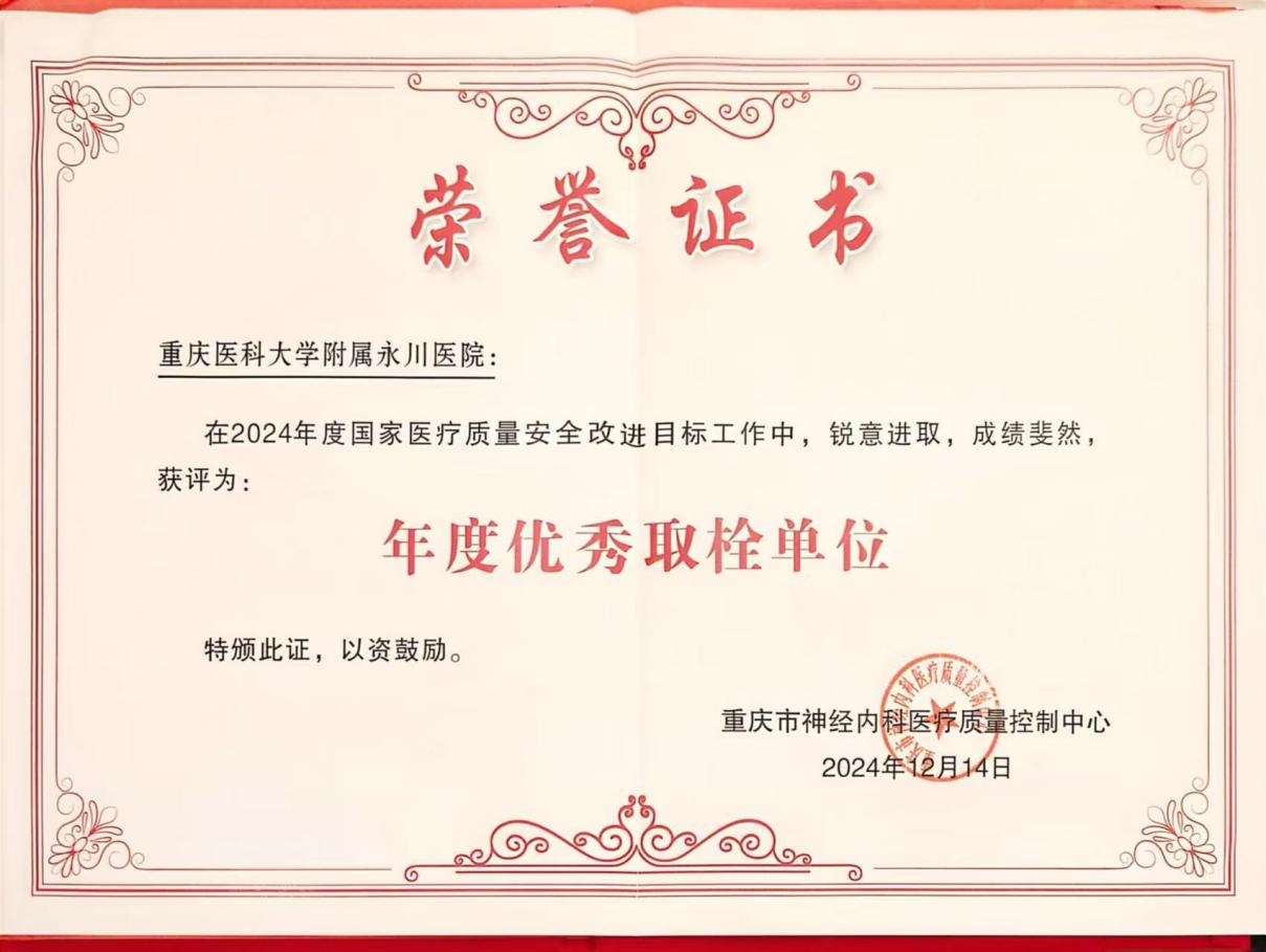 12月14日,2024年重庆市神经内科医疗质量控制中心年终总结暨百万减残工作总结会落幕,附属永川医院荣膺“年度优秀取栓单位”称号。