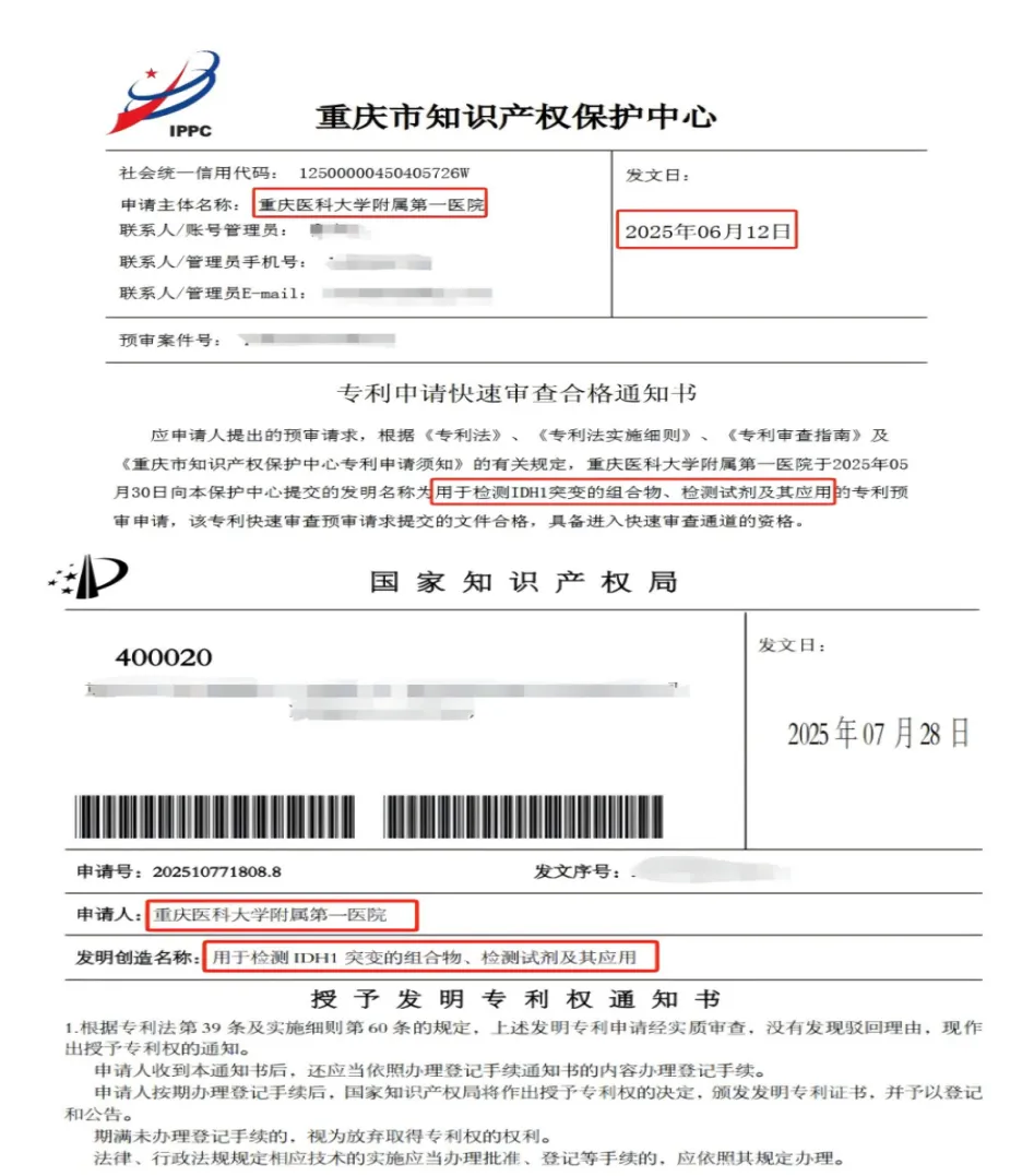 7月28日,附属第一医院首件预审发明专利《用于检测IDH1突变的组合物、检测试剂及其应用》,在经过重庆市知识产权保护中心预审后,正式获得国家知识产权局审查授权。