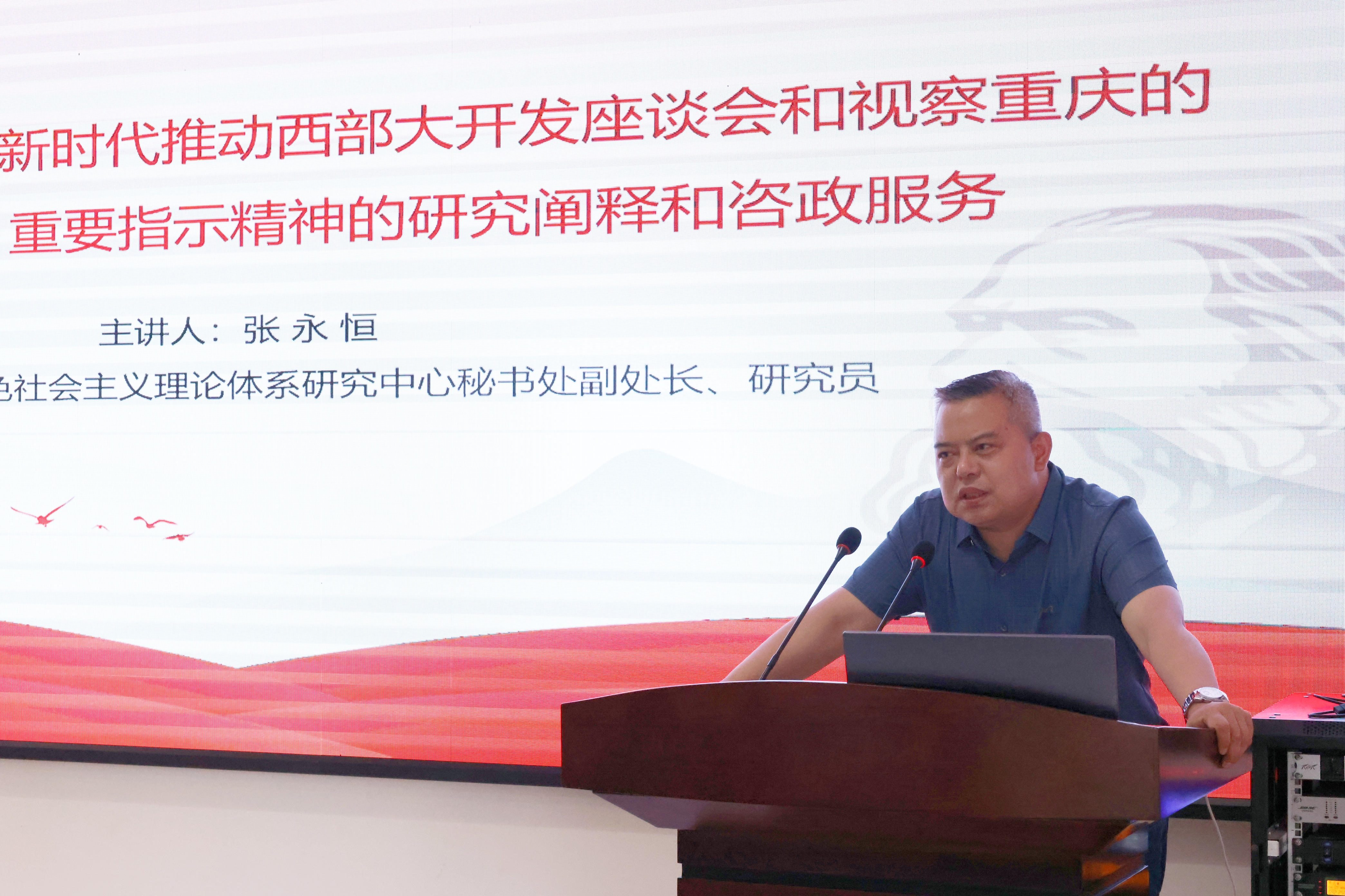 张永恒作题为“习近平总书记在新时代推动西部大开发座谈会和视察重庆的重要讲话、重要指示精神的研究阐释和咨政服务”专题讲座。他围绕习近平总书记在新时代推动西部大开发座谈会和视察重庆的重要讲话重要指示精神的丰富内涵、精髓要义及贯彻落实三个方面展开深刻论述,指明作为新时代哲学社会科学工作者特别是高校教师所应肩负的职责使命与奋进方向。他结合自身从事咨政研究的经历与体会,详尽解析了相关选题类型结构,并介绍了党的创新理论宣传阐释文章追加立项和全市哲学社会科学创新工程申报等具体情况。
