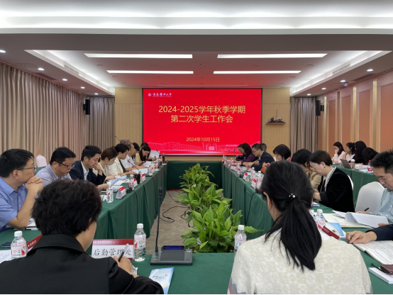 会议分两个阶段进行。第一阶段是秋季学期第二次学生工作会。党委办公室、党委宣传部、教务处、保卫处、后勤管理处、校团委等职能部门相关负责人分别就国家安全教育、校园安全稳定、消防安全教育、秋季校招季网络舆情监管、学风监督、宿舍管理、学生社团管理、“第二课堂”深化改革等工作进行了通报和安排。党委学生工作部副部长杨祖义就2025届毕业生就业工作、2024年大学生创新大赛总结暨2025年大赛启动工作、全国大学生职业规划大赛等工作进行了部署。党委学生工作部副部长周恒通报了近期学生心理健康工作及新生心理测评情况。党委学生工作部副部长滕永直重点就加强本科生日常思政教育、夯实学生日常管理以及推进辅导员队伍建设三个方面工作作出安排。