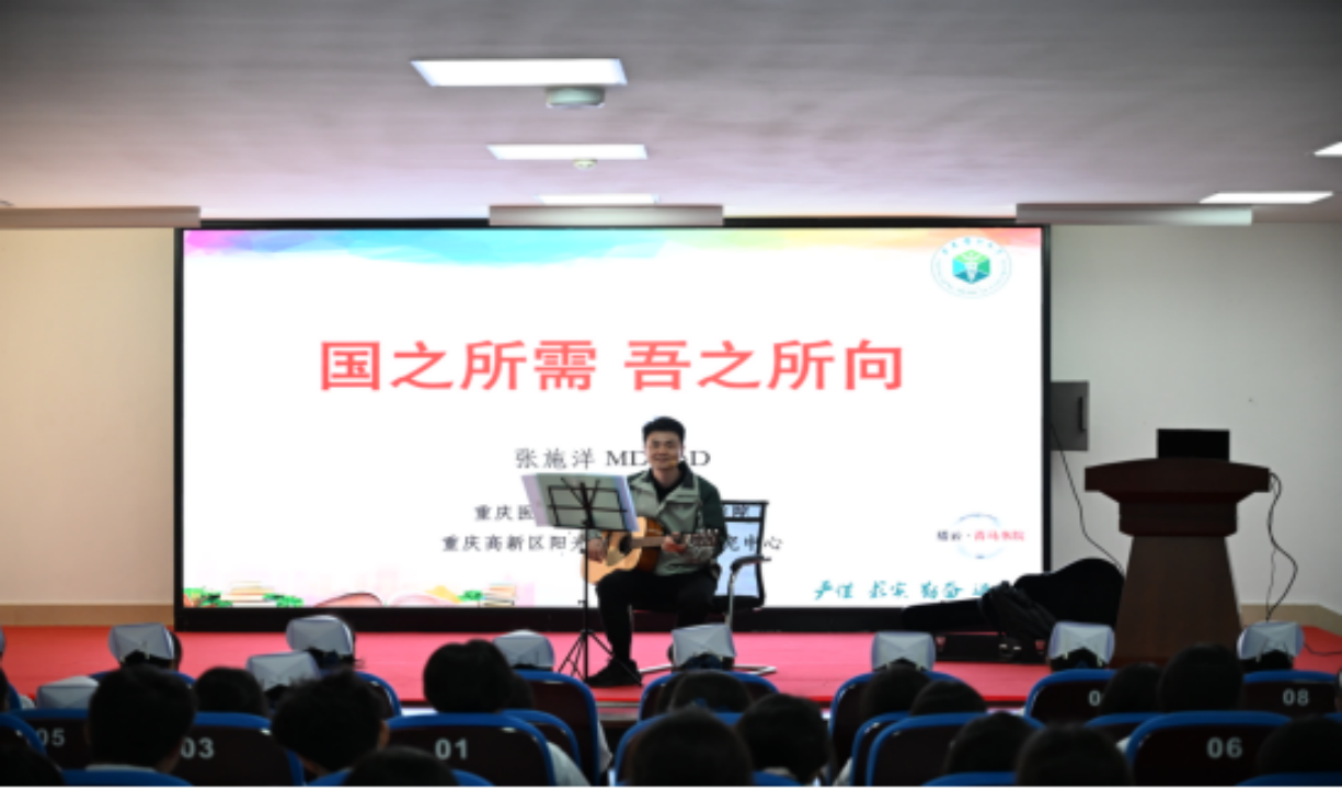 张施洋以《国之所需,吾之所向》为题,为两校师生带来一堂别开生面的爱国主义教育思政课。他用5首歌曲串联起自己的青春奋斗故事,用生动的故事、深入浅出的讲述,激励同学们坚持医学志向,坚守医者品格,坚定奉献精神,在祖国最需要的地方绽放青春之花。