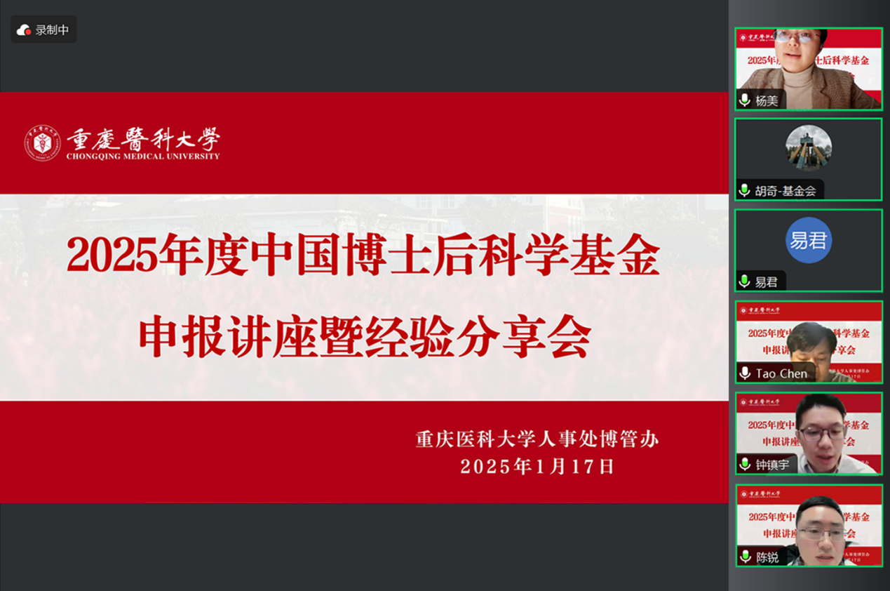 为进一步提升华体会官方版网站登录入口博士后基金申报质量,1月17日晚19:00,华体会官方版网站登录入口举办2025年度中国博士后科学基金项目线上申报讲座暨经验分享会。此次会议邀请了中国博士后科学基金会基金管理处副处长胡奇,重庆市人力社保局专技处处长、市博管办副主任易君,口腔医学院学术副院长陈陶教授,以及优秀博士后代表钟镇宇、陈锐为大家进行政策解读、申报动员与经验分享。300余位在站博士后、拟进站博士后及工作人员在线参会。会议由党委教师工作部(人事处)部(处)长杨美主持。