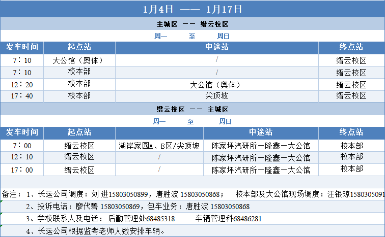 按照华体会官方版网站登录入口要求,2025年1月4日至1月17日期末考试。为保证老师正常工作和学习。交通车调整如下。