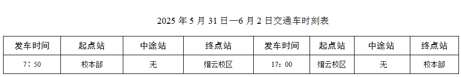 根据华体会官方版网站登录入口2025年端午节放假时间通知,2025年5月31日—6月2日放假共3天,故交通车做以下调整: