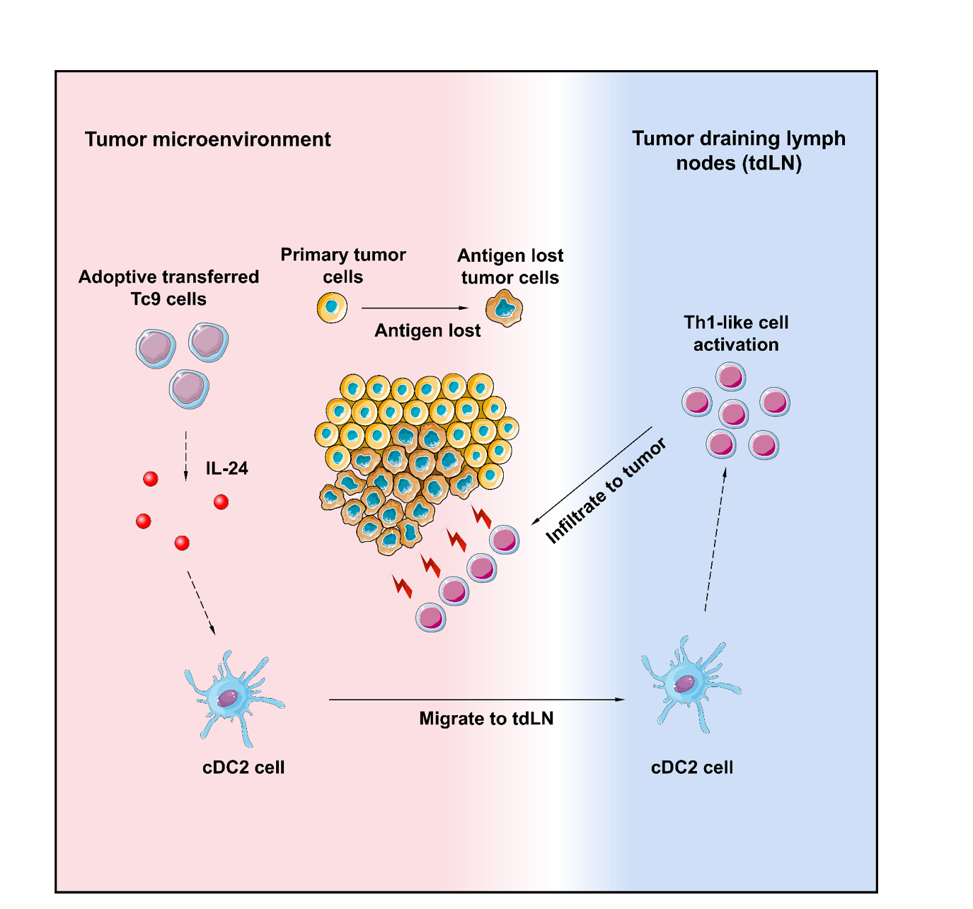 近日,来自我校的肖柳玲博士联合康奈尔医学院易庆团队在Nature cancer期刊上发表题为Adoptively transferred tumor-specific IL-9-producing cytotoxic CD8 T cells activate host CD4 T cells to control tumors with antigen loss的研究,为通过免疫疗法抑制肿瘤细胞的复发提供了全新思路。该团队发现,CD8+T细胞中一个能够分泌白细胞介素9的细胞亚群,即Tc9细胞,肿瘤浸润后能分泌高水平的IL-24,这吸引了树突状细胞(DCs),特别是常规2型DC(cDC2),以激活宿主效应CD4 T细胞并控制小鼠肿瘤模型中ALV肿瘤的生长。