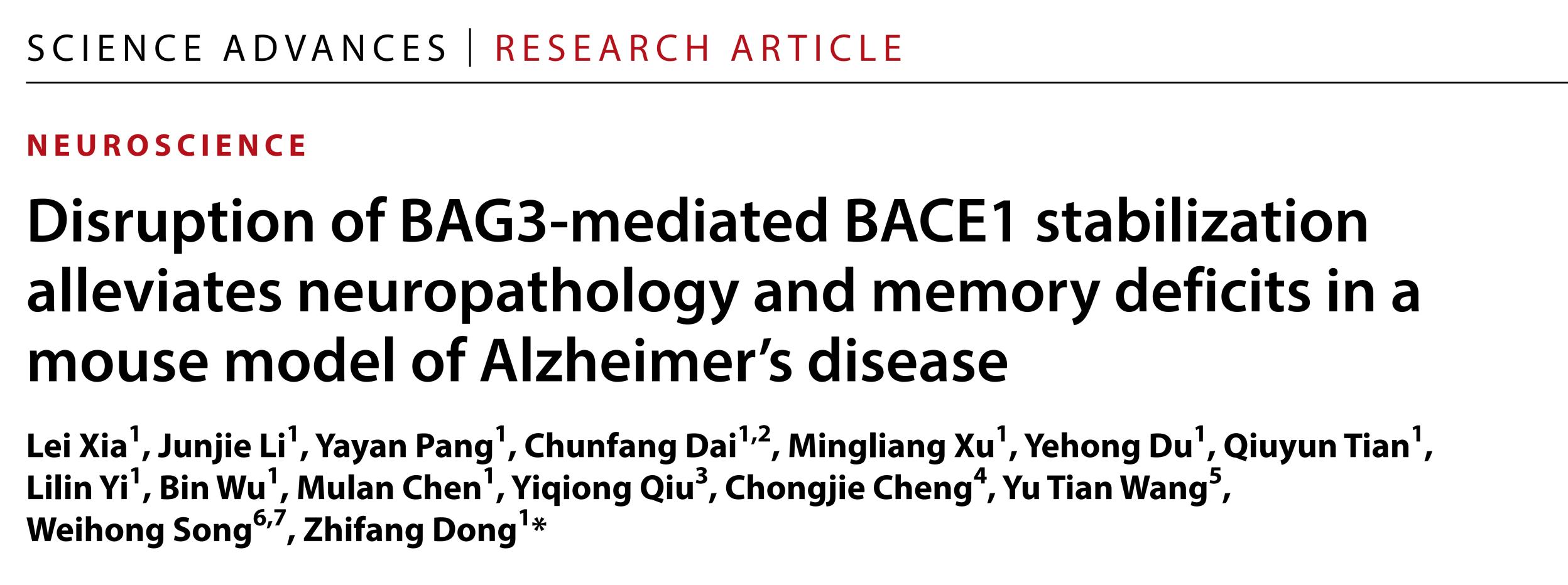 5月23日,华体会官方版网站登录入口附属儿童医院董志芳教授团队在Science Advances发表了题为Disruption of BAG3-mediated BACE1 stabilization alleviates neuropathology and memory deficits in a mouse model of Alzheimer's disease的研究论文。