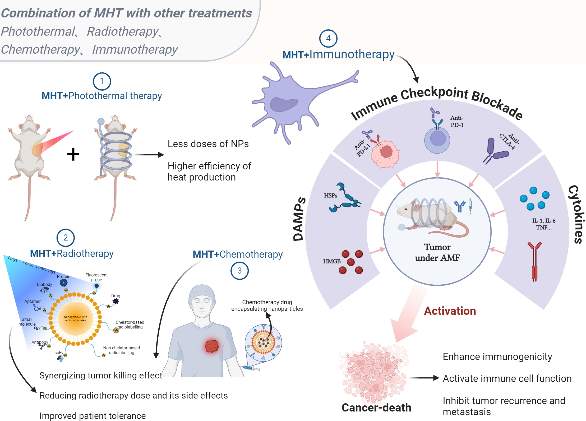 MHT的优势直击传统疗法痛点:1.靶向性增效:TME使癌细胞对高温更敏感;2.精准控温:向肿瘤注入磁性纳米颗粒(MNPs),交变磁场激活下颗粒如"微型加热器",精准维持局部温度,选择性杀伤癌细胞而不损伤正常组织;3.多维优势:非侵入性、穿透深度无物理限制(适用深部肿瘤)、可重复治疗、智能靶向、多疗法协同性及血脑屏障穿透能力。MHT在联合疗法中具有优秀表现,与放疗联用改善缺氧,提升耐药细胞敏感性;与化疗联用让药物更易进入细胞,药效提升数倍;与免疫疗法联用激活全身抗癌免疫。此外,它还能触发癌细胞多重死亡机制,包括铁死亡、铜死亡等,对抗耐药。