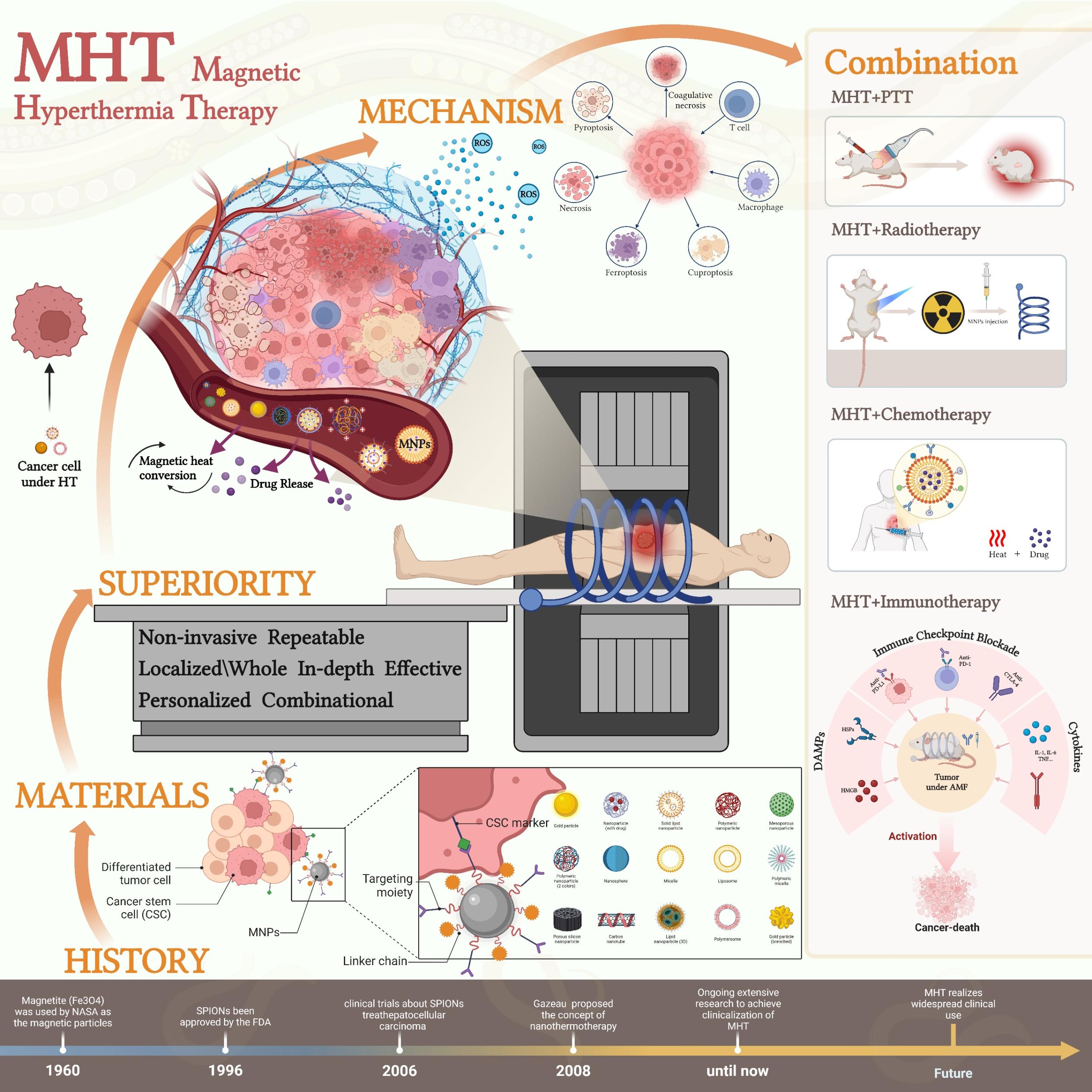 当然,技术的发展并不是一朝一夕,作者在综述中对该技术基于的纳米材料发展历程和目前最新的材料进行了介绍。自1960年代NASA用氧化铁纳米颗粒奠定基础,到如今复合材料集发热、成像、靶向于一身,成为主流。随着智能设备和可降解材料研发,MHT技术不断朝着临床化发展成熟,重构癌症治疗逻辑。