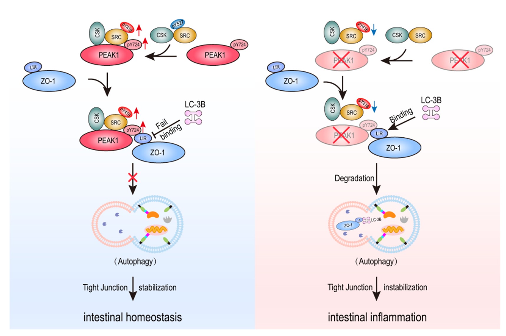 研究团队证明Peak1-/-小鼠表现出肠道紧密连接依赖性通透性增强,并且对DSS诱导的结肠炎的易感性增强。PEAK1的缺乏会破坏肠上皮细胞的屏障完整性,影响Caco-2细胞的紧密连接结构和电阻。从机制上讲,PEAK1位于紧密连接处,通过包含关键Src磷酸化残基(Y724)的特定氨基酸区域(714-731)与ZO-1相互作用。PEAK1缺陷或PEAK1/ZO-1相互作用中断会暴露ZO-1上的LC3相互作用区域,从而引发自噬介导的ZO-1降解并破坏细胞连接。此外,PEAK1缺陷与肠上皮细胞中CSK-Src相互作用增强以及Src活性降低相关。研究团队的功能和分子研究结果最终表明,PEAK1/CSK/Src复合物对于维持紧密连接至关重要,凸显了PEAK1在维护肠道屏障完整性方面发挥的重要作用。