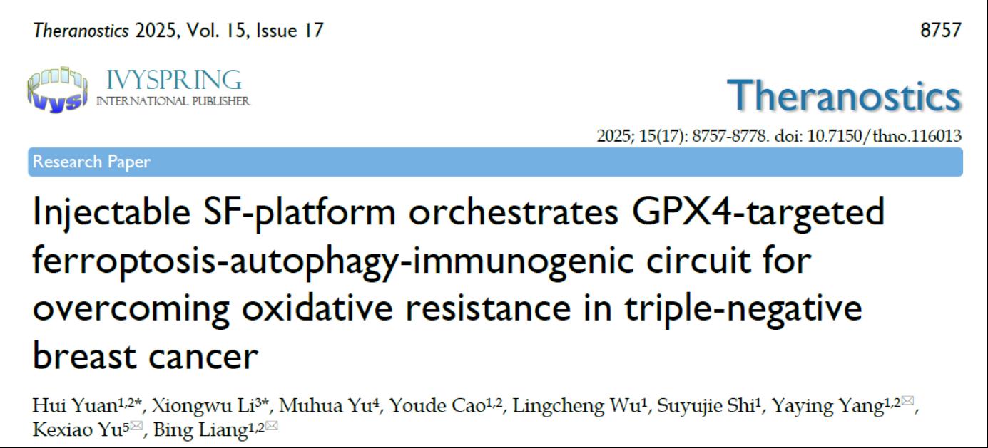 近日,基础医学院病理学教研室杨雅莹/梁冰联合重庆市中医院余柯晓,在生物医学1区杂志Theranostics上发表了题为Injectable SF-platform orchestrates GPX4-targeted ferroptosis-autophagy-immunogenic circuit for overcoming oxidative resistance in triple-negative breast cancer的研究论文,报道了一种用于三阴性乳腺癌治疗的磁性可注射丝素蛋平台。该平台由磁热响应性的丝蛋白基水凝胶(IMSFs)组成,并与时序控制的TAT-Beclin1递送系统相结合。IMSFs水凝胶搭载四氧化三铁磁性纳米颗粒和索拉非尼,通过铁离子和索拉非尼的可控释放,实现局部GPX4的抑制,并通过TAT-Beclin1的局部注射促进自噬扩大铁死亡效应,最后激活免疫,有效抑制三阴性乳腺癌的增殖和转移。