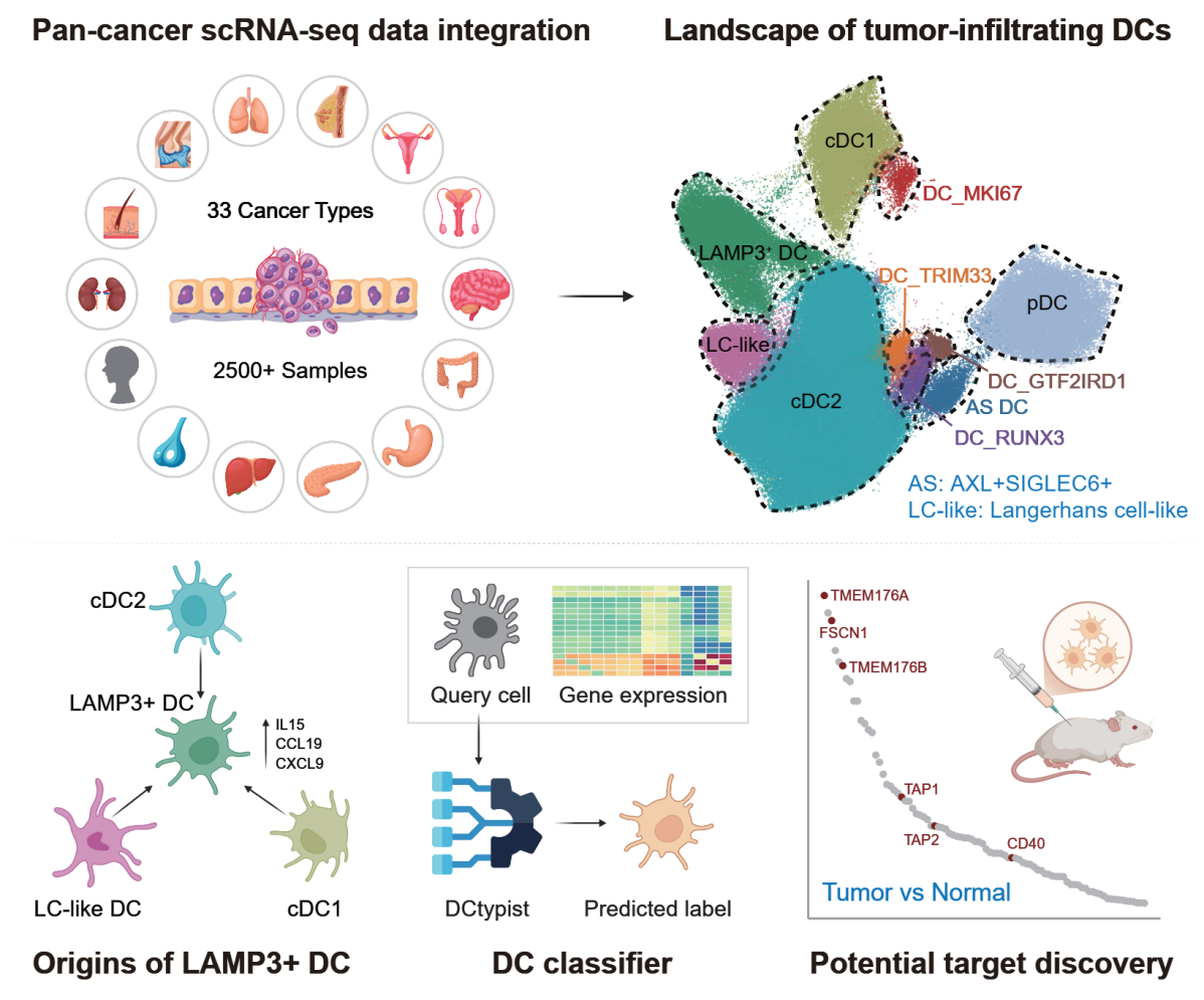 此外,研究解析了AS DC的发育来源与功能,发现其在皮肤癌、消化系统肿瘤和头颈鳞癌中富集。进一步计算分析提示AS是一种作为pDC与cDC2之间的过渡状态。同时,研究识别出广泛存在于非皮肤癌的朗格汉斯样DC,并发现其可能作为LAMP3+DC的来源之一。不同来源的LAMP3+DC功能各异,例如cDC1来源者高表达IL15、CCL19等,或具更强CD8+T细胞招募能力,并与免疫治疗应答相关。为促进科研与临床转化,团队开发了基于机器学习的DC亚群智能注释系统,实现高通量精准识别,并挖掘潜在免疫治疗靶点,为DC疫苗等策略的开发提供支持。